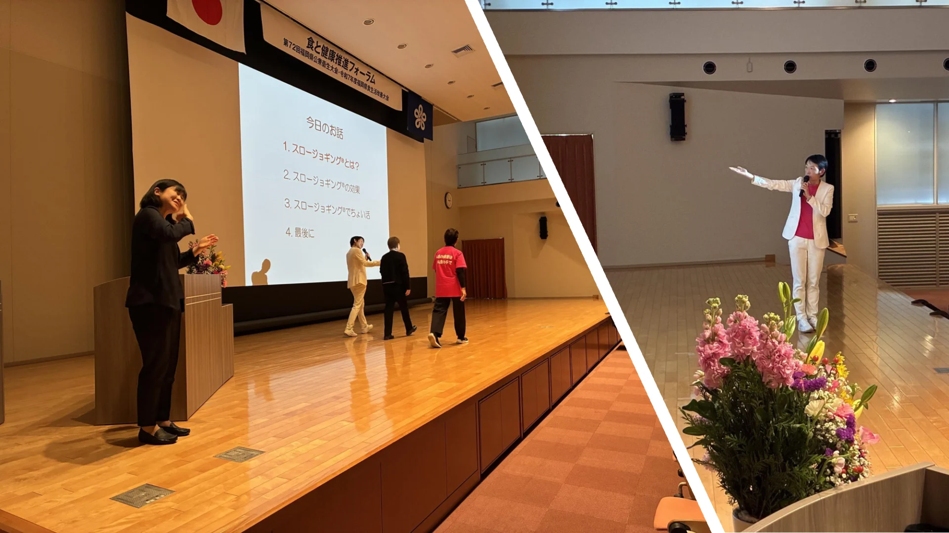 第72回福岡県公衆衛生大会・令和7年度福岡県食生活改善大会「食と健康推進フォーラム」が開催されました。 その中で、「スロージョギング健康法」の演題で講演を行ってきましたので報告します。 公衆衛生や栄養関連の福岡県知事などから表彰が行われた後、健康運動推進実践グループの表彰、活動紹介など、健康に対する意識高い系の皆さん300名が集まる中で、いつものペースで佐藤紀子理事が講演しました。 受講者の方にステージに上がって頂いての実演や、佐藤理事自身が受講者の席を回ってのインタビューなど、受講者の皆さんもニコニコ楽しまれていました。 今回の公演は手話通訳付きで、佐藤理事もなかなか経験できないことだったようです。 このような席に呼んで頂けることに感謝です。 |